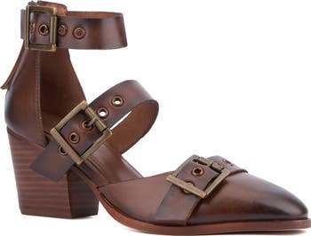 Burnished buckle hardware brings edgy appeal to this strappy sandal shaped by a pointed toe and rendered in supple leather.
