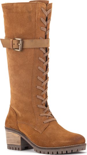 It's boot season! Make a statement in the Naomi. A throwback knee high boot gets updated with a head turning lace up style, statement buckle and a chunky heel. Rock it with your favorite pair of jeans or a boho chic dress. Sizing: True to size. - Round toe - Lace-up vamp - Top strap detail with adjustable buckle - Cushioned footbed - Stacked block heel - Approx. 13.5" shaft height, 12.5" opening circumference - Approx. 2.5" heel - Lug sole - Imported