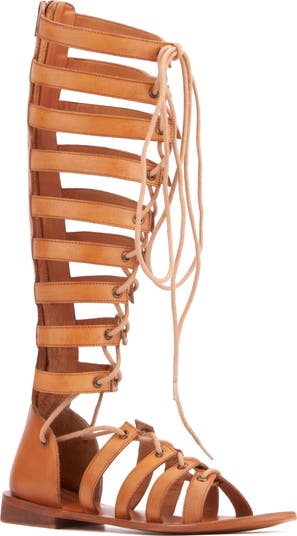 A lace-up design brings edgy appeal to a strappy gladiator sandal secured by a full-length zipper and rendered in supple leather.