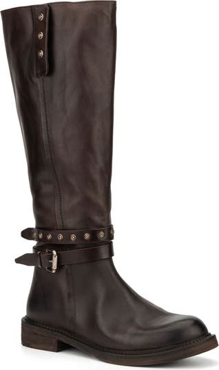 Studs define the wraparound strap details set into this classic tall boot.