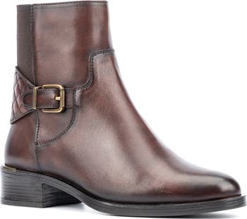 Buckled straps and quilted stitching bring edgy style to this moto-inspired boot grounded by a stacked block heel.