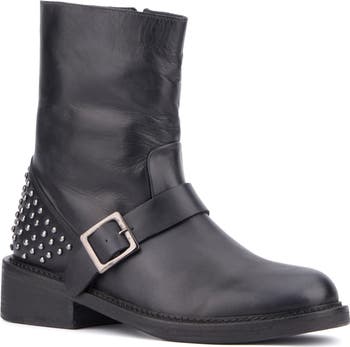 Polished studs and a belted-strap compliment the polished leather of a rugged, street-savvy boot. A low block heel and round toe complete the versatile silhouette of this mid-shaft style.