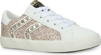 Shining stars detail the sporty stripes of this glittery sneaker that's sure to delight your kiddo.