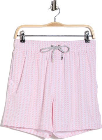 A unique pattern emboldens the look of swim shorts cut with a touch of stretch for surf-to-sand comfort.