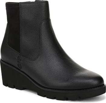 A chunky wedge heel and sturdy lug sole create a sturdy foundation on a versatile bootie fitted with a side zipper for easy entry. Built-in VioMotion technology offers contoured arch support, with shock-absorbing cushioning and a deep heel cup to provide stability and forefoot flexibility.