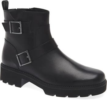 Buckled hardware amps up the rough and rugged look of this leather bootie ground by a durable lugged sole.