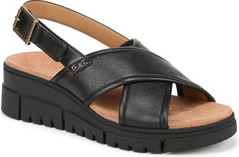 The Uptown's lightweight, supportive and flexible sole enhances the cushioned comfort already built into this slingback sandal sporting crisscrossing vamp straps and a chunky wedge heel.