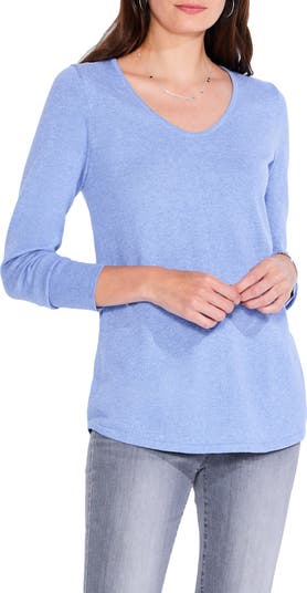 This classic cotton-blend sweater is a closet essential with its rounded V-neck and curved shirttail hem.