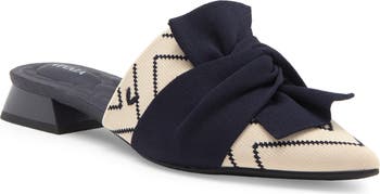 A knotted detail brings eye-catching texture to this pointy-toe mule featuring a flexible rib-knit upper sourced from recycled plastic bottles.