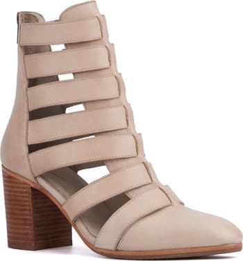Elevate any look with this caged almond-toe bootie fashioned with a strappy cutout vamp and lifted by a stacked block heel.