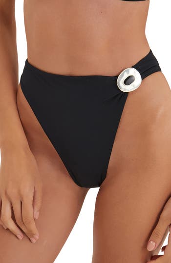 Gleaming hardware sits at the side of these high-waist bikini bottoms with flirty high legs.