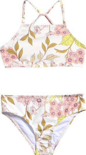 They'll make a style splash in this three-piece floral swim set featuring a rashguard, strappy bikini top and matching bottoms.