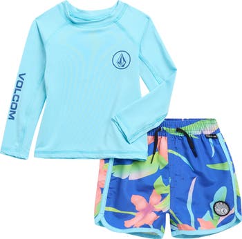 Protect delicate skin from the harsh sun in this long-sleeve rashguard, paired with lightweight swim trunks, made for water play.