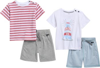 Keep your little guy feeling comfy and looking fresh on sunny days in this four-piece set featuring two crewneck T-shirts, one striped and the other decked in a beach graphic, to go along with two pairs of stretchy drawcord shorts.