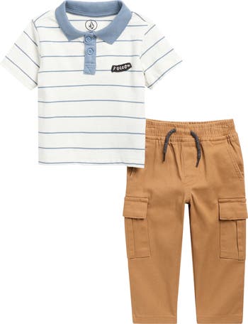 Keep your little one feeling comfy and looking cool in this two-piece set including a striped cotton-blend polo and coordinating pull-on cargo pants.