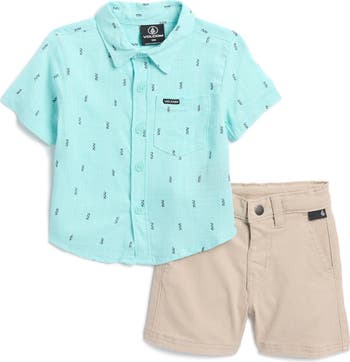 Your young trendsetter is ready to take on beach days in a sun-ready set that includes a striped button-up and coordinating shorts.