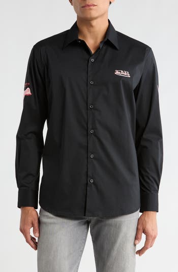 Made of a soft and lightweight blend, this button-front shirt features a classic spread collar and bold logo graphics on the chest and back.