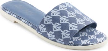 Logo jacquard embroidery playfully patterns the denim vamp strap of a casual slide sandal with a bright white grip sole for a sporty finish.