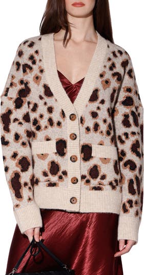 Get cozy in this fabulous leopard-spotted cardigan knit from soft, woolly yarns in a comfortably relaxed fit.