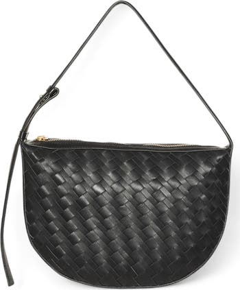 A rich leather shoulder bag features an intricate woven design, an adjustable strap, and just the right amount of space for your day-to-night essentials.