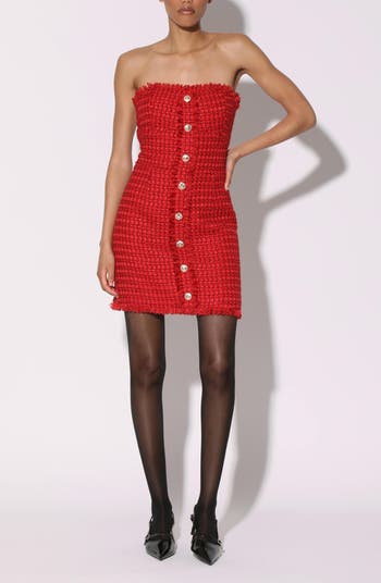 Turn heads in this fiery tweed minidress constructed in a strapless silhouette framed by gleaming buttons and fringed trim.