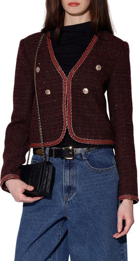 Ornate coin buttons and padded shoulders detail the posh silhouette of classic tweed jacket framed with a festive braid trim and fully lined for a high quality finish.