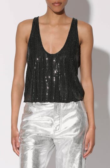 A deeply scooped neckline amps up the party-ready vibe of this shell tank that's covered in rhinestones that expertly catch the light of the dance floor.