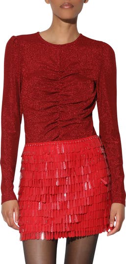 A shimmering finish draws attention to this fitted long-sleeve top that's fronted with ruching.