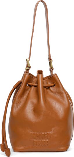Brassy hardware finesses a luxury leather bucket bag featuring a subtle raised logo and simple shoulder strap for easy everyday styling.