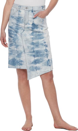 Take a twirl in the trippy vibe of this denim skirt splashed with tie-dye and finished with an asymmetrical frayed hemline.