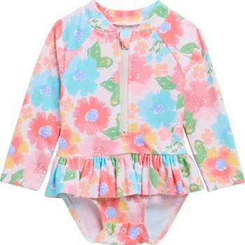 Pretty ruffles lend playful flair to this quick-drying raglan-sleeve swimsuit made with built-in UPF 50+ sun protection.