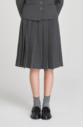 Sharp knife pleats texture a tasteful skirt that serves scholarly polish in a knee-length silhouette.