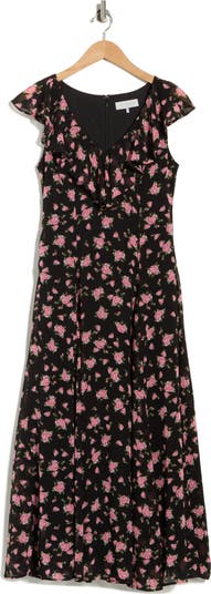 A romantic floral print adorns this charming chiffon midi dress framed by a ruffled neckline and inset godets at the hem that flutter with every step.
