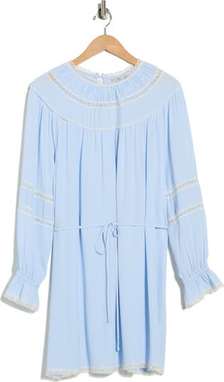 Delicate lace trim lends a sweet finishing touch to a long-sleeve dress cut to a stem-baring length to make it a romantic choice for date nights.