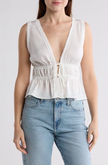 Delicate ties add a trendy flourish to the front of a sultry shirred tank edged in lace to turn up the heat of your night-out look.