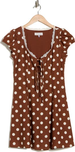 A delicate lace trim and sweet polka-dot print add romantic appeal to a minidress that's sure to charm any audience on brunch outings to date nights and beyond.