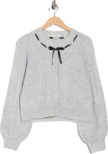 Laced ribbon trim sweetens this cozy cable-stitched cardigan accented by pearly buttons and balloon sleeves for luxe style.