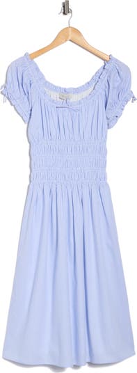 Shirring at the waist defines the fit of a breezy cotton midi dress patterned in slim stripes and adorned with dainty bows for a coquettish vibe.