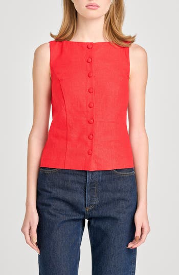A linen blend gives an air of breeziness to this sleeveless top secured by buttons falling down the front.