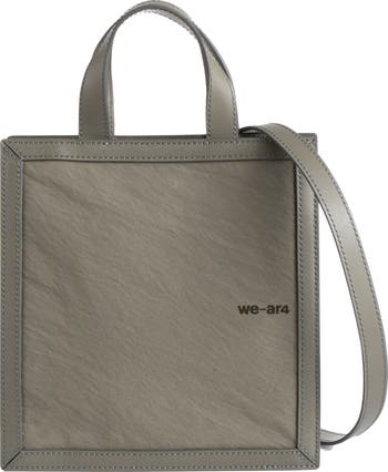Signature logo detailing distinguishes a compact tote crafted in a structured silhouette of flexible paper and trimmed with leather.
