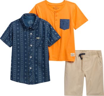 They will be ready for the day ahead with this comfortable outfit that pairs a button-up shirt with a coordinating henley top and shorts.