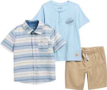 Your kiddo will have endless sunny-day options with this set featuring a poplin button‑up, graphic henley and pull‑on shorts.