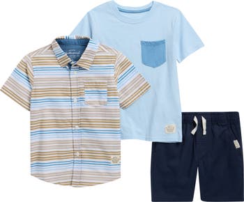 Dress your little dude for any event with this three-piece set featuring a striped poplin button-up shirt, a crewneck pocket tee and drawstring shorts you can pair with either top when the sun is out.