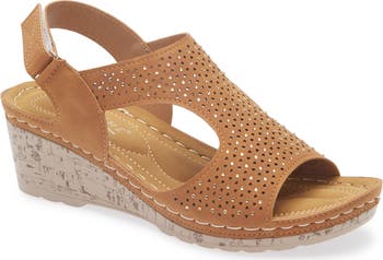 Plush cushioning and a supportive wedge heel help combat everyday fatigue in this slingback sandal styled with laser-cut perforations and shimmering rhinestones for a charming finish.