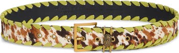 Cow-printed genuine calf hair and bright-green whipstitching lend rich detail to a belt that takes your everyday look to the next level.