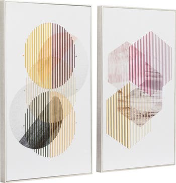 Add fun, artsy style to your home or office with this dimensional abstract art! Each rectangular silver wood frame houses a white canvas with textured screen-printed shapes; one depicting two gray and black circles reminiscent of full moons, and the other piece depicting two light pink and white hexagons with marbled effects.