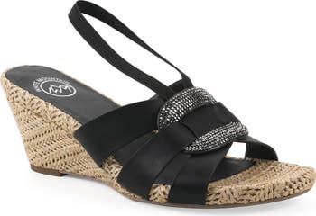 This strappy sandal sandal set on a sculpted espadrille wedge dazzles with a circular beaded brooch.