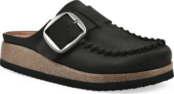 Bold whipstitching and an oversize buckle styles a well-cushioned mule, featuring a roomy toe box and a supportive platform sole.