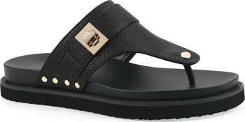 Gleaming hardware shines on the textured faux leather of this platform sandal ready for everyday wear.