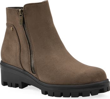 A chunky sole with toothy lugs grounds this round-toed bootie outfitted with dual side zippers for easy entry.